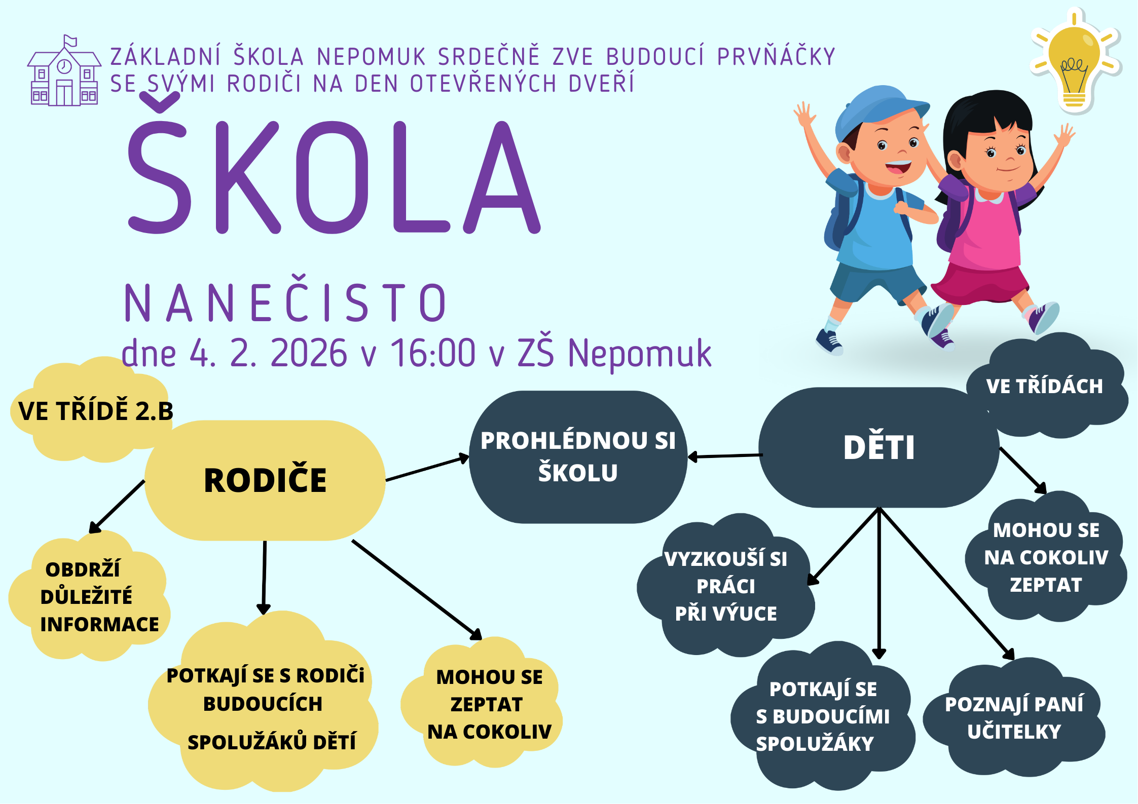 Škola nanečisto 2026 Letos opět zveme všechny budoucí prvňáčky ve středu 4. února 2026 od 16,00 Ve středu 4. února 2026 od 16.00 se naše škola otevře všem budoucím prvňáčkům, kteří si spolu se svými rodiči mohou vyzkoušet, jaké to je být školákem. Škola nanečisto Sdílej stránku: